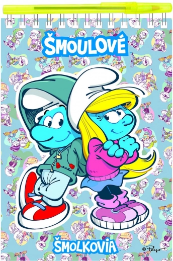 Praktičen zvezek z motivom Smrkov združuje črtne in prazne strani, ima trd, sijajen ovitek, zgornjo spiralno vezavo twin wire in je dobavljen skupaj z kemičnim svinčnikom v prozorni vrečki.