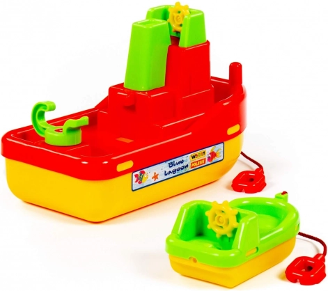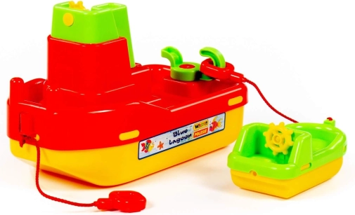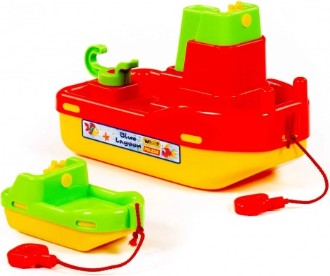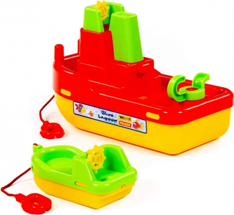 Vlačilec je opremljen s kavljem in vrvjo, s katerima lahko otroci preprosto priključijo in vlečejo manjšo ladjico – kot na pravi vodi.