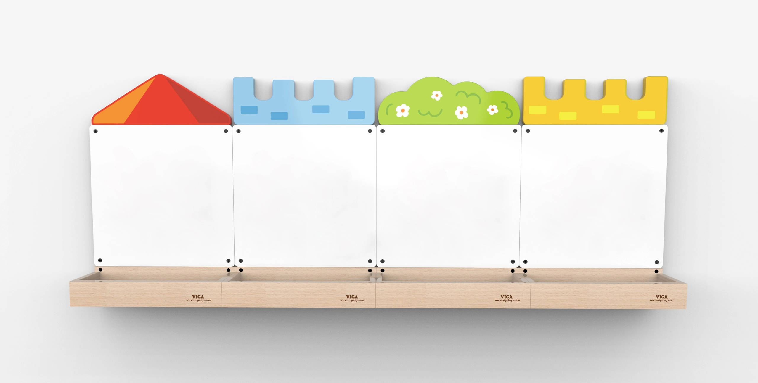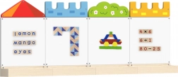 Komplet ne vsebuje dodatnih magnetnih kock, vidnih na slikah. Komplet vsebuje 4 magnetne table, 4 dekorativne elemente in 4 kontejnere za table.