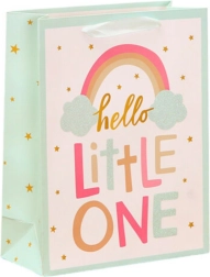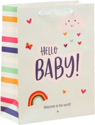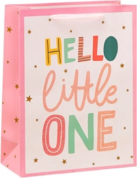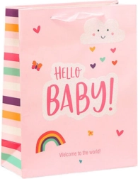 Ta darilna vrečka za otroke s pastelnim dizajnom je idealna za podarjanje ob rojstvu otroka, baby showerju ali prvem rojstnem dnevu. Okrašena z ljubkimi motivi z napisi »Hello Baby« in »Hello Little One«, ta vrečka prinaša veselje in toplino v vsak praznični dan.