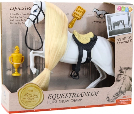 Lep set s konjem in belimi dodatki je idealen za otroke, ki imajo radi živali in konje. Vsebuje krtačo, pokal, sedlo in uzdo za realistično igro.