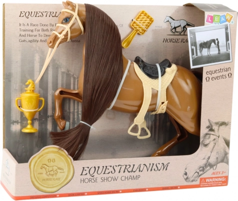 Realistično izdelan konj s čudovito, mehko grivo, ki jo je mogoče česati in oblikovati po lastnih željah, ponuja ustvarjalno in privlačno igro, ki razvija domišljijo in fino motoriko. Dodatki, kot so sedlo, uzda in zlati pokal, otroke spodbujajo k ustvarjanju lastnih scenarijev ter igri dodajajo večjo pristnost.