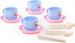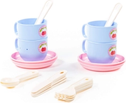 V kompletu boste našli 4 skodelice s krožnički in jedilni pribor. Vse je mogoče pomivati in se enostavno čisti.