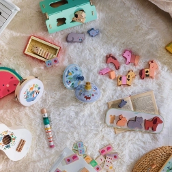Ilustracije Sarah Betz otroke motivirajo k ustvarjalnosti in izmišljanju zgodb. Je odličen način, da se otroci spoznajo z osnovnimi fizikalnimi pojavi, kot je gravitacija. Na voljo so tri tematske različice – živalice, sejem in prevozna sredstva.