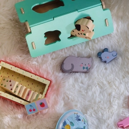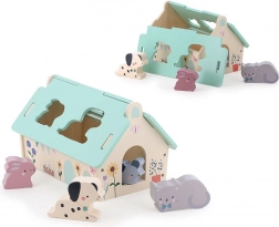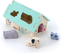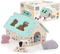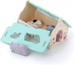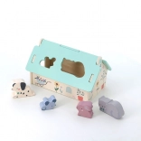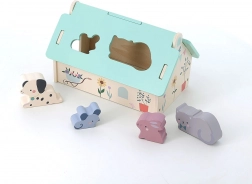Ta lepo izdelana lesena hišica v nežnih barvah je zasnovana po ideji Sarah Betz in ima snemljivo streho z oblikovanimi odprtinami za vstavljanje živalic. Gre za zgodnjo igračo, navdihnjeno z Montessori, ki otroke motivira k razvoju številnih veščin: