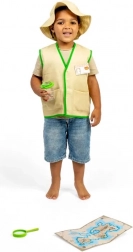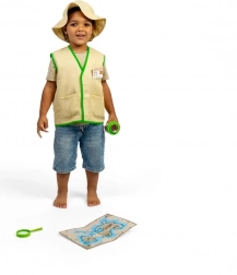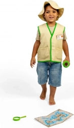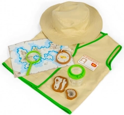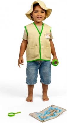 Kostum raziskovalca je idealen za razvoj domišljije in ustvarjalnosti. Vključuje telovnik, klobuk, imensko značko, podroben zemljevid, lupo, lesene fosile, kompas in posebno lupo za opazovanje žuželk, kar zagotavlja odlično zabavo in učenje.