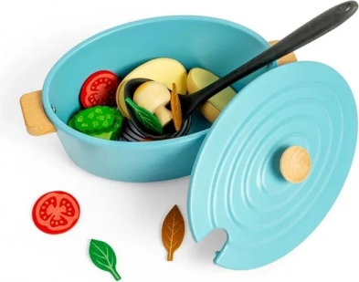 Pripravite okusno družinsko jed z otroško peka posodo in bogatim priborom. Ta igrača ponuja veliko vrst lesenih kosov zelenjave in pomaga otrokom razvijati socialne ter ustvarjalne veščine.
