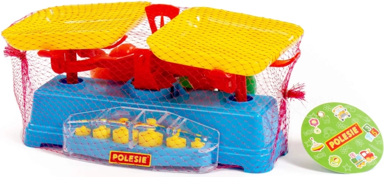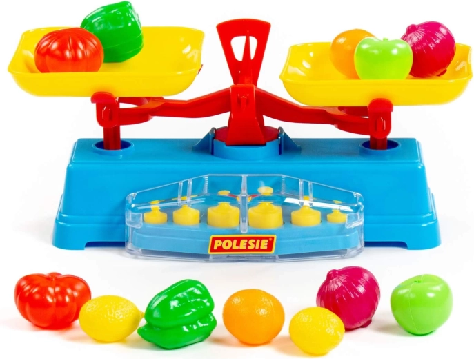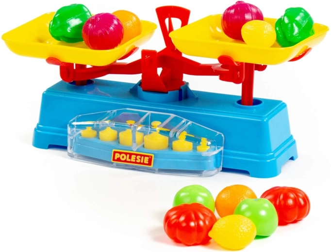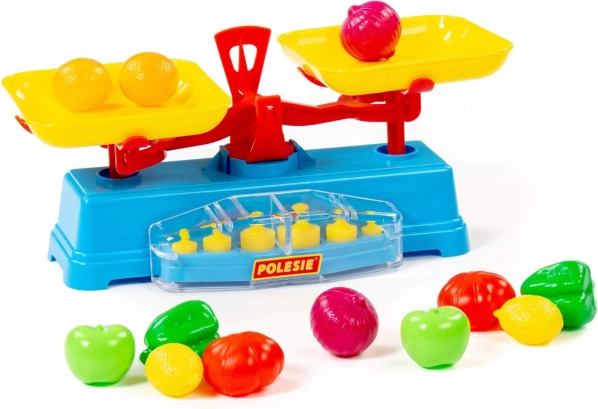Igralni komplet vključuje tehtnico, dve posodi in 6 uteži.