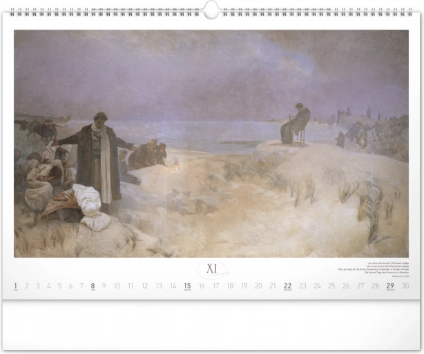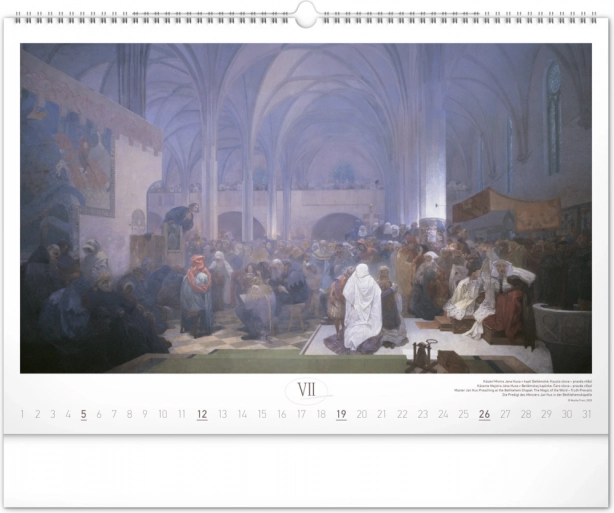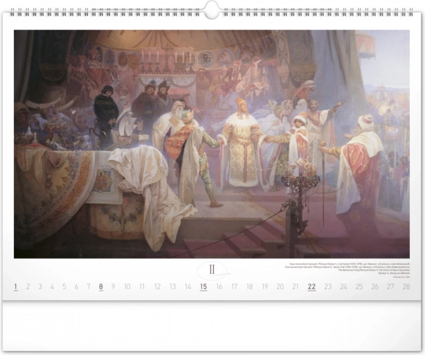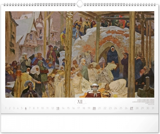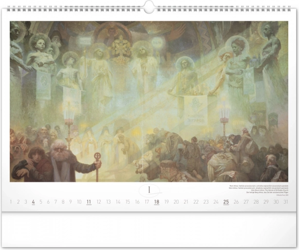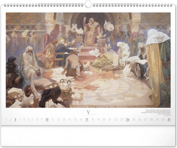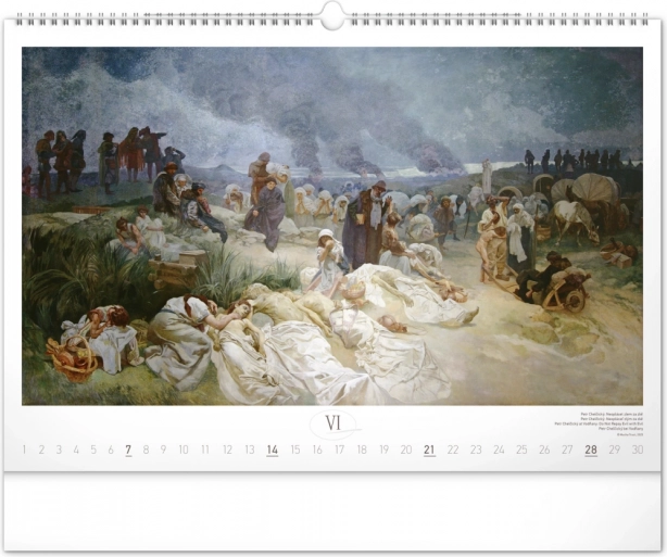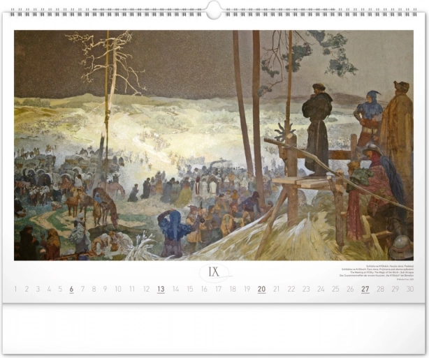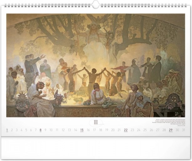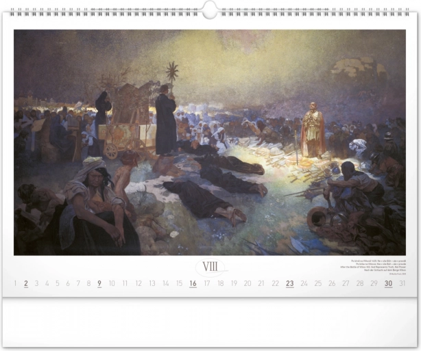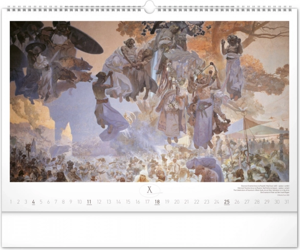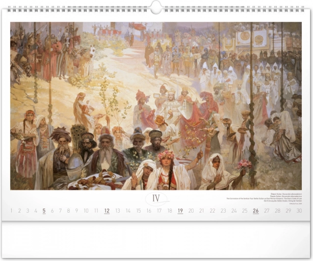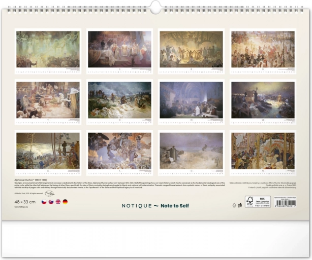 Stenski koledar z reprodukcijami mojstrskih del Alfonse Muche iz serije Slovanska epopeja, idealen za ljubitelje umetnosti in zgodovine.