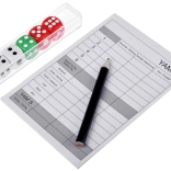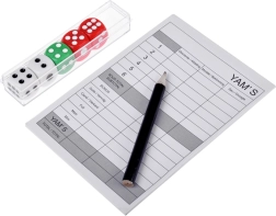 Ta univerzalni komplet prinaša vse, kar potrebujete za igro Yams in druge naključne ter družabne igre. Kocke z dobro berljivimi pikami, priloženi blok za zapisovanje rezultatov in svinčnik vam omogočajo igranje kjerkoli in kadarkoli. Zahvaljujoč čvrstemu etuiju imate dodatke vedno na enem mestu.
