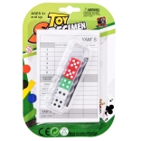 Pet klasičnih šeststranskih kock, točkovni blok, svinčnik in trpežno etui – pripravljeno za igro v nekaj trenutkih.