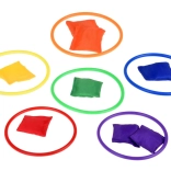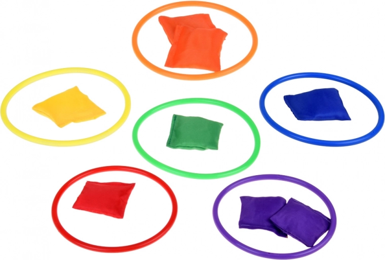 Ta igralni set je idealen za otroke, ki radi aktivno preživljajo čas. Vsebuje šest barvnih stožcev, dvanajst tekstilnih vrečk in dvanajst plastičnih obročev, ki omogočajo različne vrste iger. Otrokom lahko izboljšajo koordinacijo in natančnost pri metanju in ciljanju.