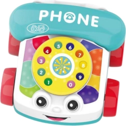 Telefon je opremljen z vrtečim številčnikom, barvnimi elementi in nasmejanim obrazom, kar spodbuja otroka k interakciji ter odkrivanju sveta zvokov, oblik in gibanja. Premični deli, kot sta številčnik ali kolesca, spodbujajo otrokovo radovednost in ga vzpodbujajo k aktivnemu raziskovanju.
