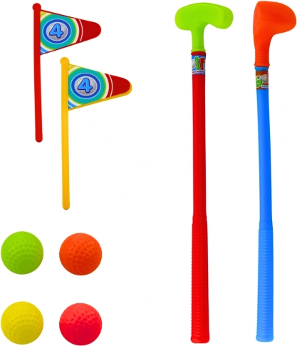 Celovit komplet vsebuje vse, kar je potrebno za začetek golfskih dogodivščin: 3 lahke, barvite golf palice, 4 golf žogice, 2 zastavici z luknjo, ki ju je mogoče postaviti kjer koli, ter mobilni voziček.