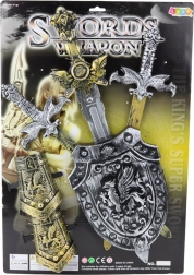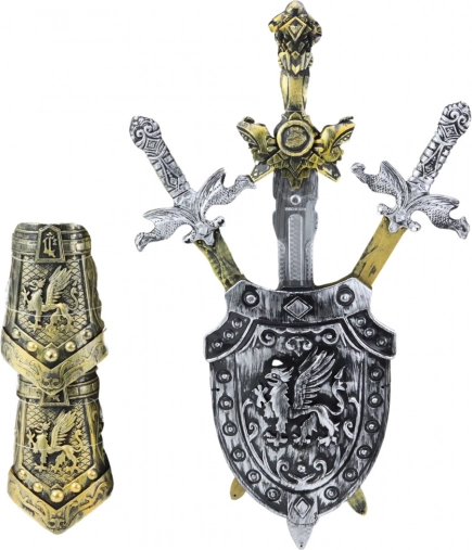 Komplet vključuje tri različne viteške meče, vključno z enim večjim, glavnim orožjem bojevnika, okrašen ščit s heraldnim motivom ter dva ščitnika za roke, ki posnemata dele oklepa. Vsi deli so izdelani iz lahke, a trpežne plastike, ki je varna in odporna na intenzivno igro.