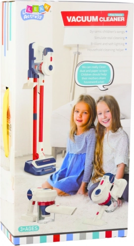 Otroški čistilni set z realističnim belim sesalnikom in dok postajo, idealen za igro doma in v vrtcih.