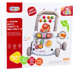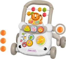 Hojnik ima pisano zasnovo z motivi živali, kot sta lev in zajec, ki pritegneta otrokovo pozornost in spodbujata k aktivnosti. Trdna konstrukcija zagotavlja varnost, medtem ko široka osnova in štiri vzdržljiva kolesa povečujejo stabilnost. Poseben ročaj pomaga, ko se otrok uči hoditi. Vgrajene zvočne funkcije in mehanske igrače razvijajo koordinacijo ter čute sluha in tipa.