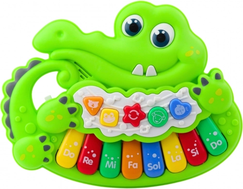 Interaktivni klavirček krokodil z lučkami in živalskimi zvoki za otroke, zelen. Podpira razvoj skozi igro.