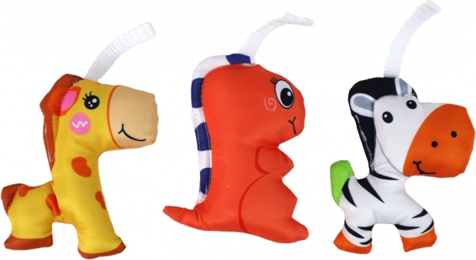 Osrednji element so tri barvite plišaste igrače – zebra, žirafa in rdeči dinozaver, ki se vrtijo po zagonu karuselice. Njihovo gibanje pritegne otrokovo pozornost in spodbuja sledenje, kar pozitivno vpliva na razvoj koordinacije oko–roka. Intenzivne barve, prijazne oblike in mehka tkanina spodbujajo otrokove vidne, tipne zaznave ter domišljijo.