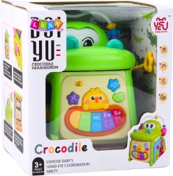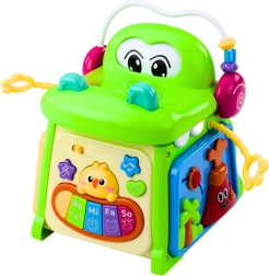 Interaktivna krokodilja kocka je opremljena s klavirjem z barvnimi tipkami »Do, Re, Mi, Fa, So«, premičnimi komponentami za manipulacijo ter uro z gibljivima kazalcema. Vsaka stran kocke ponuja različne aktivnosti, kar ohranja otrokovo zanimanje dlje časa. Zaradi zaobljenih robov in velikih komponent je igrača varna ter spodbuja razvoj ročnih spretnosti.