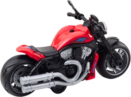 Motor je zasnovan v intenzivni rdeči barvi in izdelan iz visokokakovostne plastike, odporne na vsakodnevno uporabo. Opremljen je s širokimi kolesi, masivnim ohišjem in ergonomskimi ročaji, kar zagotavlja stabilnost in udobje med igro. Njegov videz je navdihnjen s klasičnimi enoslednimi vozili, kar mu daje avtentičnost.