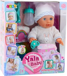 Lutka je oblečena v pisano bluzico z zajčkom, udobne hlače in ljubko kapico. V roki drži dudo, v pakiranju pa najdete tudi potrebne pripomočke za hranjenje in nego, vključno s stekleničko, kahlico in plenico.