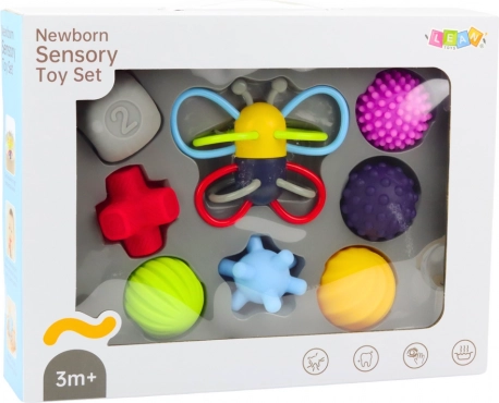 Set je bil razvit ob upoštevanju potreb najmlajših otrok, za katere je svet predvsem niz čutnih dražljajev. Vsebuje različne barvne elemente z izrazito teksturo, obliko in funkcijami – vsi so zasnovani za spodbujanje dotika, vida in koordinacije oko-roka. Igrače pomagajo pri učenju prijemanja, odkrivanju novih površin in oblik ter podpirajo razvoj fine motorike in senzorne integracije.