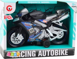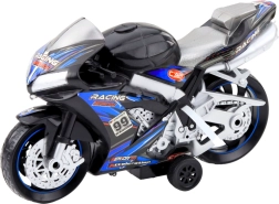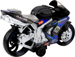 Črno-modri motocikel je izdelan iz odporne plastike, ki je zaščitena pred poškodbami, in je opremljen z močnimi kolesi za varno vožnjo po različnih površinah. S pritiskom na gumb se aktivirajo zvočni in svetlobni učinki – realistični zvoki motorja in svetlobna predstava zagotavljajo nepozabno izkušnjo.