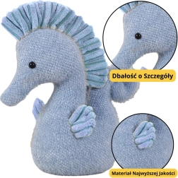 Modri morski konjiček navduši z videzom, dodelanim do najmanjših podrobnosti. Ima varne oči, skrbno oblikovan smrček in učinkovito strukturirano grebenje, zaradi česar deluje realistično in estetsko.