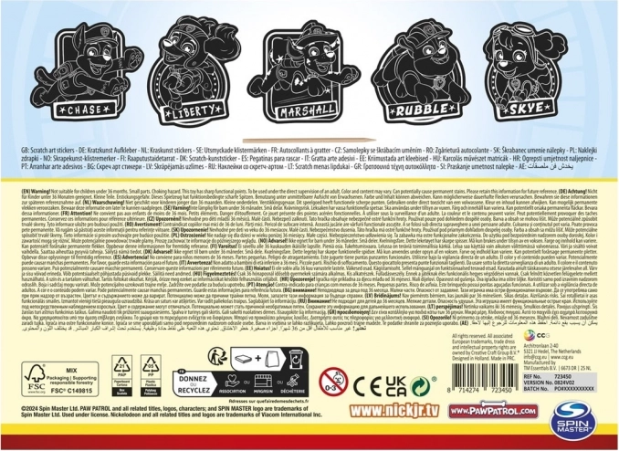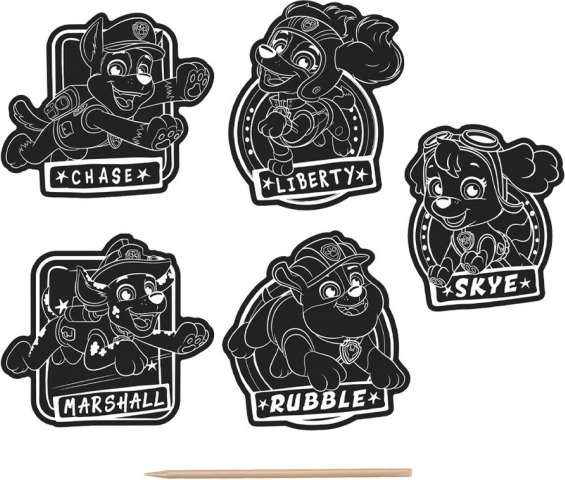 Ustvari svojo zbirko nalepk z motivi TAČJE PATRULJE. Dovolj je, da nežno postrgaš črno plast in postopoma razkriješ žive barve ter podrobnosti posameznih likov. Končani motivi so samolepilni, zato jih lahko takoj uporabiš za okrasitev šolskih potrebščin, daril ali voščilnic.
