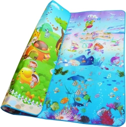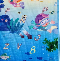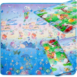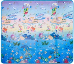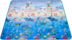 Dvostranska penasta igralna podloga za otroke ponuja mehko in varno mesto za igro in učenje. Ena stran prikazuje morski svet s črkami in številkami, druga pa veseli živalski vrt. Podloga izolira pred mrazom, blaži padce in se zlahka čisti – dovolj je, da jo obrišete z vlažno krpo.
