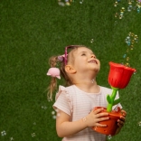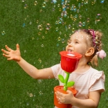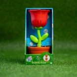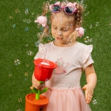 Cvetlični dizajn je ne le prisrčen, temveč tudi praktičen – stabilen “lonček” se dobro prilega malim otroškim rokam. Komplet vsebuje kar 2×40 ml kakovostne raztopine, zato lahko začnete takoj po razpakiranju. Za delovanje so potrebne 3× AA baterije (niso priložene).