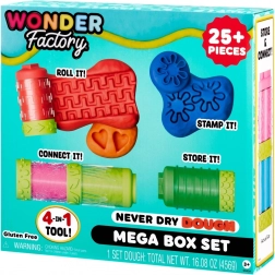 Set Wonder Factory Never Dry Dough Mega Box vsebuje naš posebni plastelin, ki se nikoli ne izsuši, je prijazen do okolja in čudovito diši. Vključuje tudi univerzalno orodje 4 v 1, s katerim lahko: