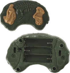 Upravljalnik v obliki fosila z dvema gumboma: en za hojo in premikanje tac, drugi za luči, zvok in premike glave.
