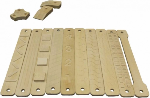 Deske imajo različne vzorce, zato lahko otroci okrepijo svoj tip. Hoja z bosimi nogami po deskah doda še eno dimenzijo zabave. Set vsebuje 10 različnih desk in komponente za enostavno montažo za dvignjeno postavitev.