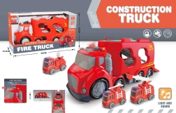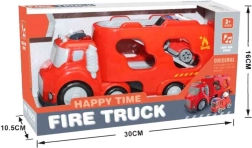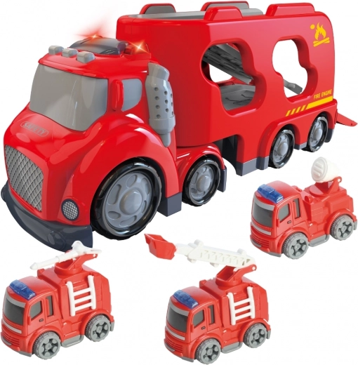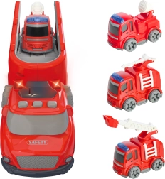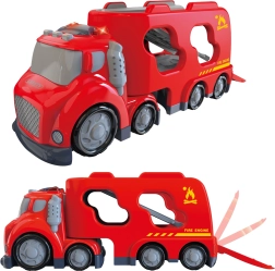 Vlečni tovornjak Fire Truck iz serije CITY TRUCK je popolna igrača za vsakega malega ljubitelja motornih vozil in mestnih specialnih vozil. Vsebuje rdeči vlečni tovornjak, ki prevaža majhno gasilsko vozilo, izdelano iz trpežne plastike in opremljeno z svetlobnimi in zvočnimi učinki, ki se aktivirajo s pritiskom na gumb na strehi vozila..