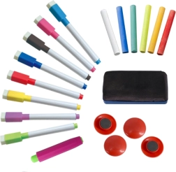 - 8 vodnih markerjev, 6 barvnih kred, 1 gobica/krpica, 4 magneti