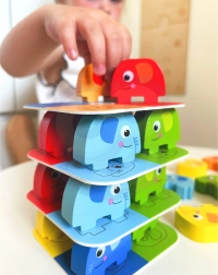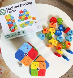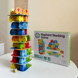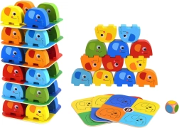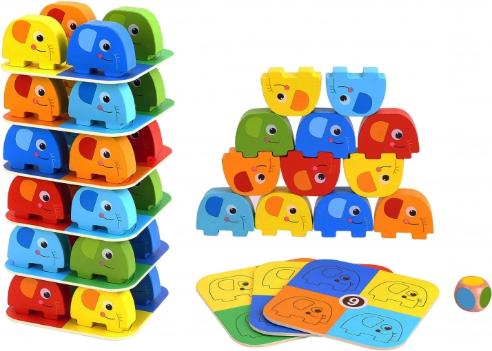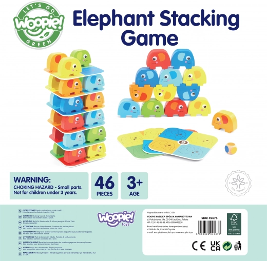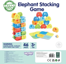 Doživite zabavo in pustolovščino z igro Slon na slonu znamke Woopie. Igra vsebuje 46 kosov, vključno z barvnimi kockami in igralnimi kartami. Je idealna za skupno preživljanje časa z družino. Žive barve in prikupne oblike pritegnejo pozornost in ponujajo dve fascinantni možnosti igre – kot zložljiva igra ali kot alternativa Jengi.