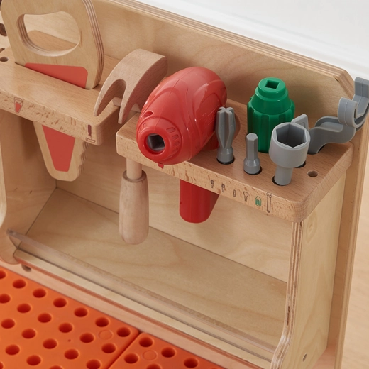 - Vsebuje stojalo za orodja za shranjevanje kompleta: ročna orodja – igračo kladivo, žago, ključ, trikotnik ter leseni blok za vajo in električni vijačnik, vrtalnik ter komplet nastavkov.
