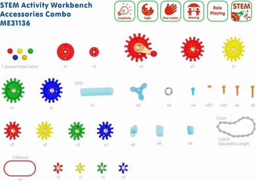 Komplet zobnikov in koleščkov znamke Masterkidz je zasnovan za montažo na njihovem specializiranem sistemu Masterkidz STEM. Otroci obožujejo zobnike in mehanizme, ki so fascinantni in ponujajo čudovit pogled na povezano delovanje. Montažo je mogoče preprosto izvesti s pomočjo posebnih vijakov za orodja znamke Masterkidz.