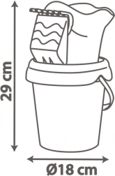 Set vsebuje vse, kar je potrebno za igro: vederček s premerom 18 cm s sitom, grabljicami, lopatko, modelčkom v obliki srčka ali cvetlice ter kanglico za vodo. Kompaktne mere in višina z dodatki 29 cm olajšajo prenašanje in shranjevanje.