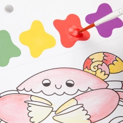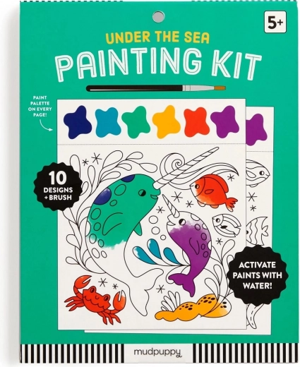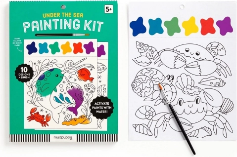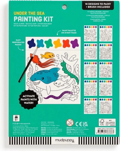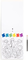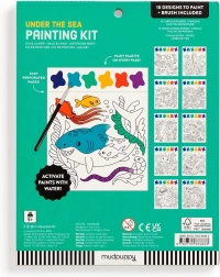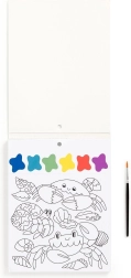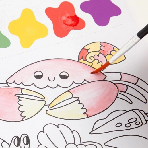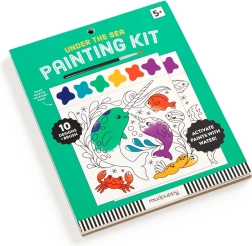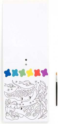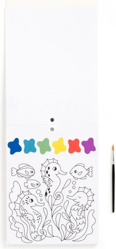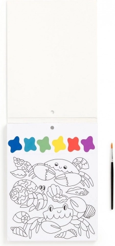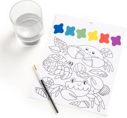 Slikarski set vsebuje čopič in 10 predtiskanih listov za barvanje, vsak z motivom morskega življenja in barvno paleto. Dovolj je, da navlažite čopič in začnete ustvarjati! Vsak list je poleg tega perforiran, kar omogoča enostavno ločitev končane slike.