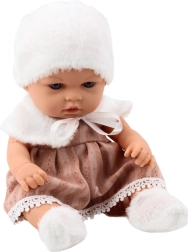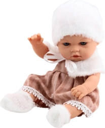 Dojenček je oblečen v bežno obleko z izvezeno teksturo in čipko, dopolnjeno z belim krznenim ovratnikom ter mehko kapico z zavezovanjem pod brado. Celoten vtis dopolnjujejo krznene nogavičke, ki punčki dajejo prijeten zimski videz.