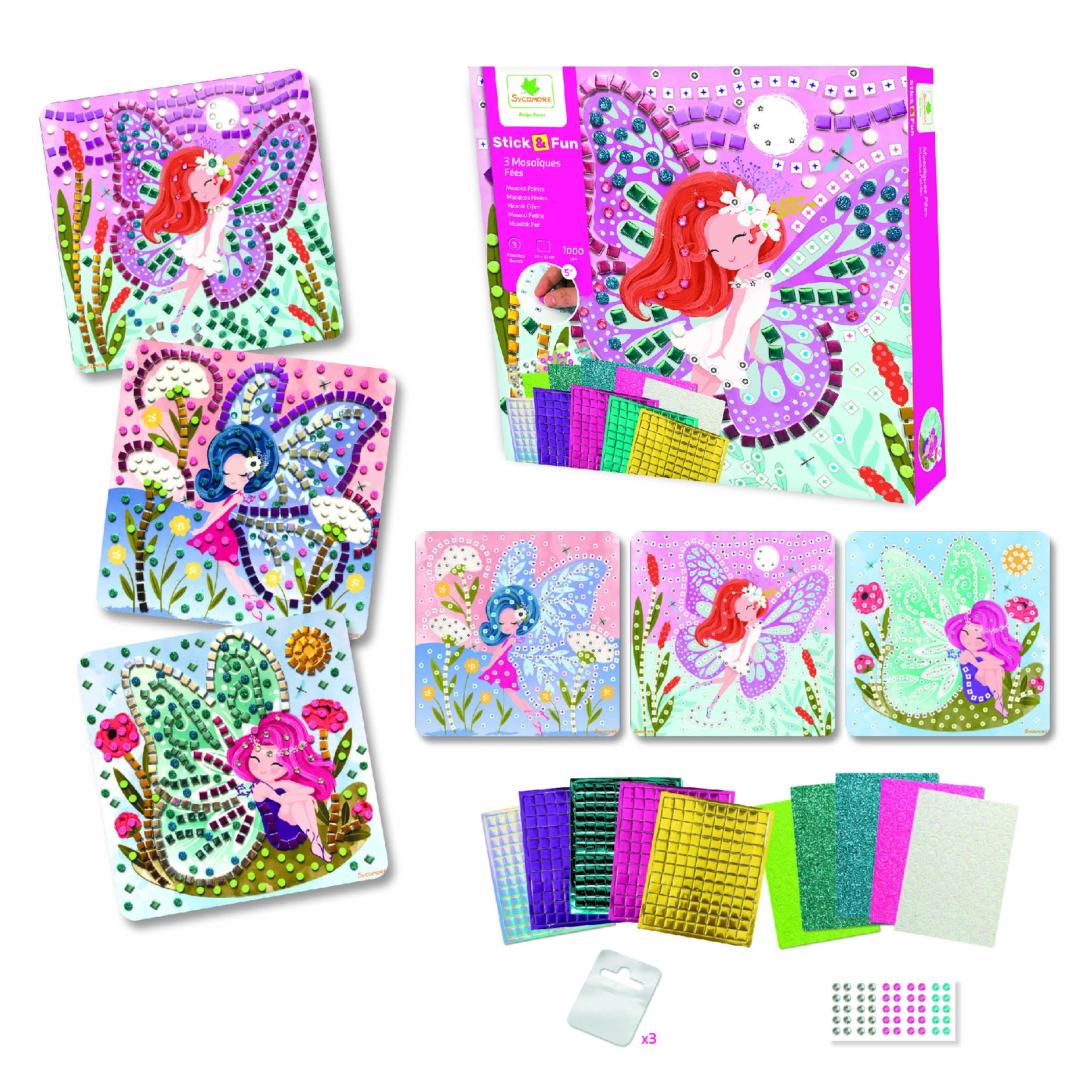 Otroci bodo navdušeni, ko bodo lahko ustvarili svoje čudovite mozaikaste slike z vilami. S samolepilnimi kamenčki in bleščečimi mozaikastimi koščki bodo dokončali vsako sliko, ki bo zasijala v svojem edinstvenem blišču. Ko bodo slike končane, jih lahko ponosno razstavijo s priloženimi prozornimi obešali.