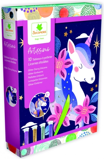 Vstopite v pravljično kraljestvo bleščečih samorogov s tem ustvarjalnim kompletom. Odkrijte čarobnost ustvarjanja z bleščečim peskanjem, ki bo navdušila otroke in odrasle. Vse je shranjeno v priročni škatli z magnetnim zapiranjem.