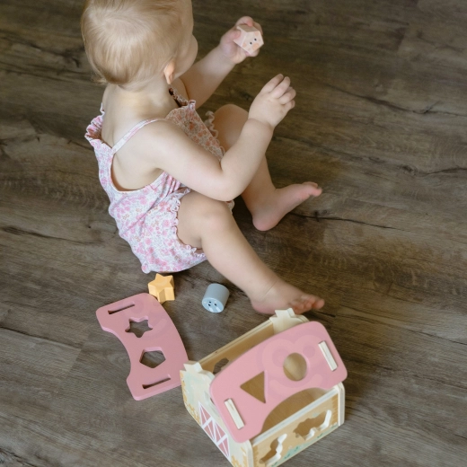 Ljubek lesen hlev z izrezi za živali in oblike spodbuja otroke k aktivni igri in naravnemu učenju. Z vstavljanjem pravih delčkov otroci urijo potrpežljivost, zbranost in razumevanje vzroka in posledice. Pastelna, naravna zasnova se odlično poda v otroško sobo.