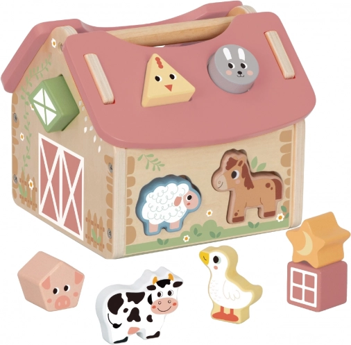 Streha se preprosto odpre za lažje jemanje delčkov in pospravljanje. Previdno obdelani leseni elementi z zaobljenimi robovi zagotavljajo varno igro. V kompletu je izbor živali (kravica, ovčka, konjiček, gos) in potiskanih oblik, ki podpirajo razvoj besednega zaklada in domišljije.