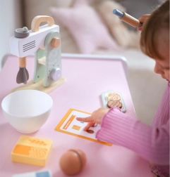 Odkrijte čar peke z lesenim mešalnikom v nežnih pastelnih barvah, ki otrokom omogoča posnemati svet odraslih. Od vrtenja gumba do mešanja v skledi – realistične podrobnosti in varni zaobljeni elementi iz kakovostnega lesa ga naredijo za idealen dodatek k vsaki otroški kuhinjici.