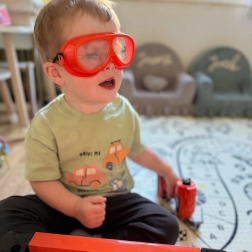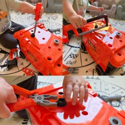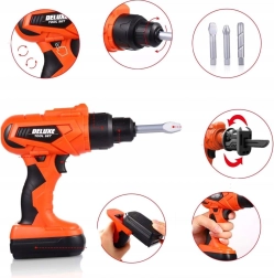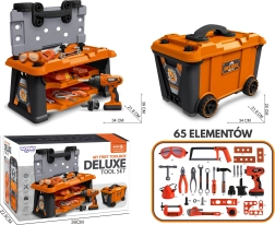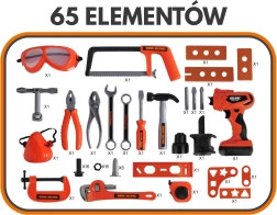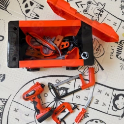 Del kompleta je večnamensko baterijsko orodje z zamenljivimi nastavki, bogat nabor vijakov, matic in plastičnih »desk« za vajo privijanja, vrtanja in sestavljanja. Ne manjkajo zaščitna očala in druga uporabna dodatna oprema za realistično, a varno igro.