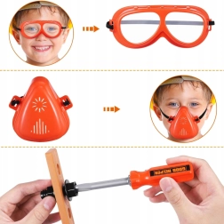 Priloženi so zaščitna očala, vpenjalna sponka, žagica, klešče, izvijači in ključi. Otroci lahko varno preizkusijo delo kot pravi obrtniki.